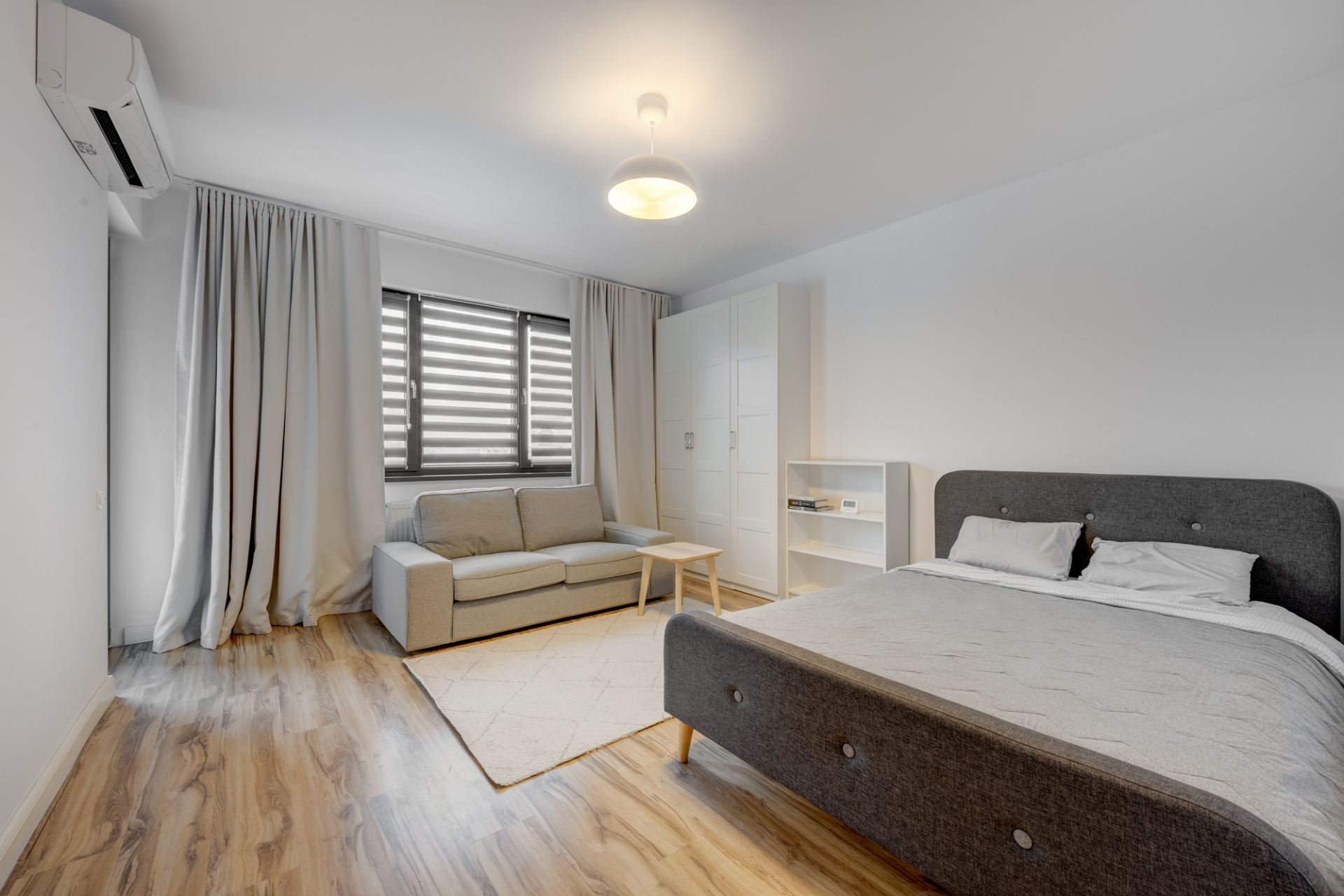 Livingul este generos si amenajat atat cu pat cat si cu canapea, dulap pentru haine, etajera si o masuta de cafea. Spatiul permite si amplasarea unui birou. In cazul in care este nevoie, proprietarul poate achizitiona un TV.