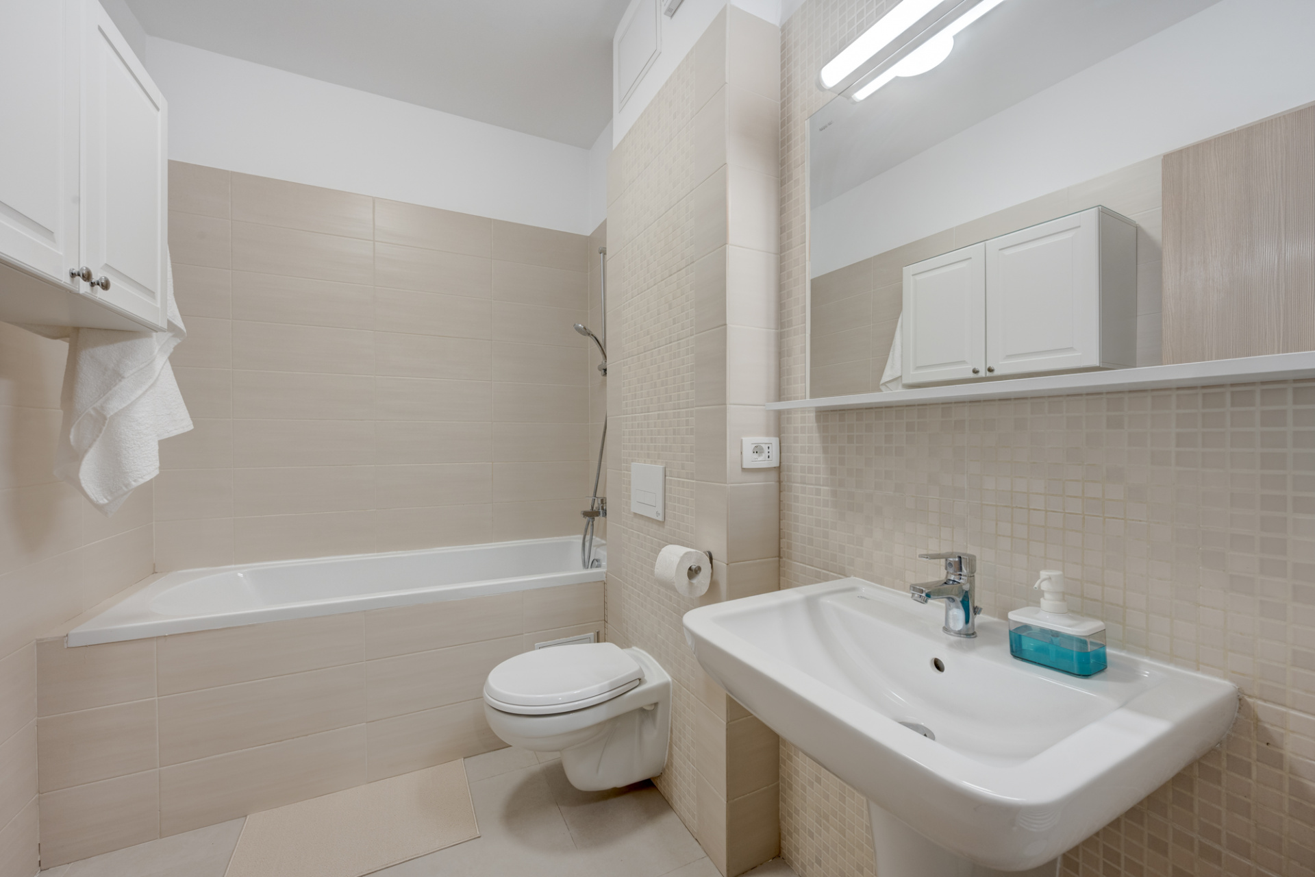 Bucataria este mobilata si utilata complet, echipata cu masina de spalat vase ( versiune mica), plita, cuptor, hota, frigider. Tot in bucatarie este amenajat un loc pentru servit masa.
