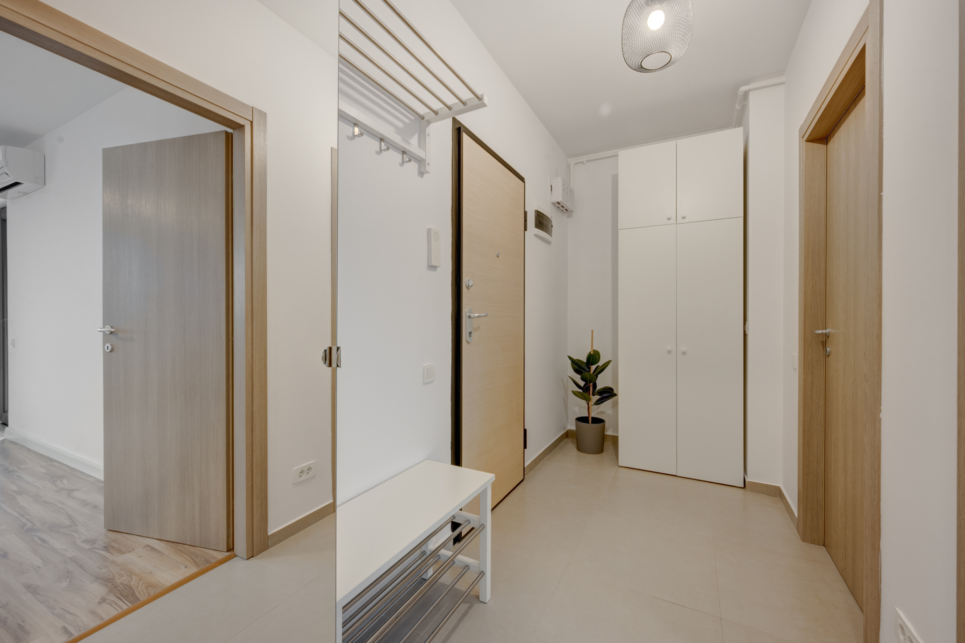 Garsoniera este situata la etajul 4/9, intr-un imobil construit in anul 2018, are o compartimentare decomandata cu o suprafata de 37,28 mp, din care 35,18 mp utili si balcon 2,10 mp. Toate incaperile sunt separate si bucataria este inchisa. Holul de la intrare este amenajat cu spatii pentru depozitare, cuier, pantofar si un dulap care mascheaza masina de spalat rufe.