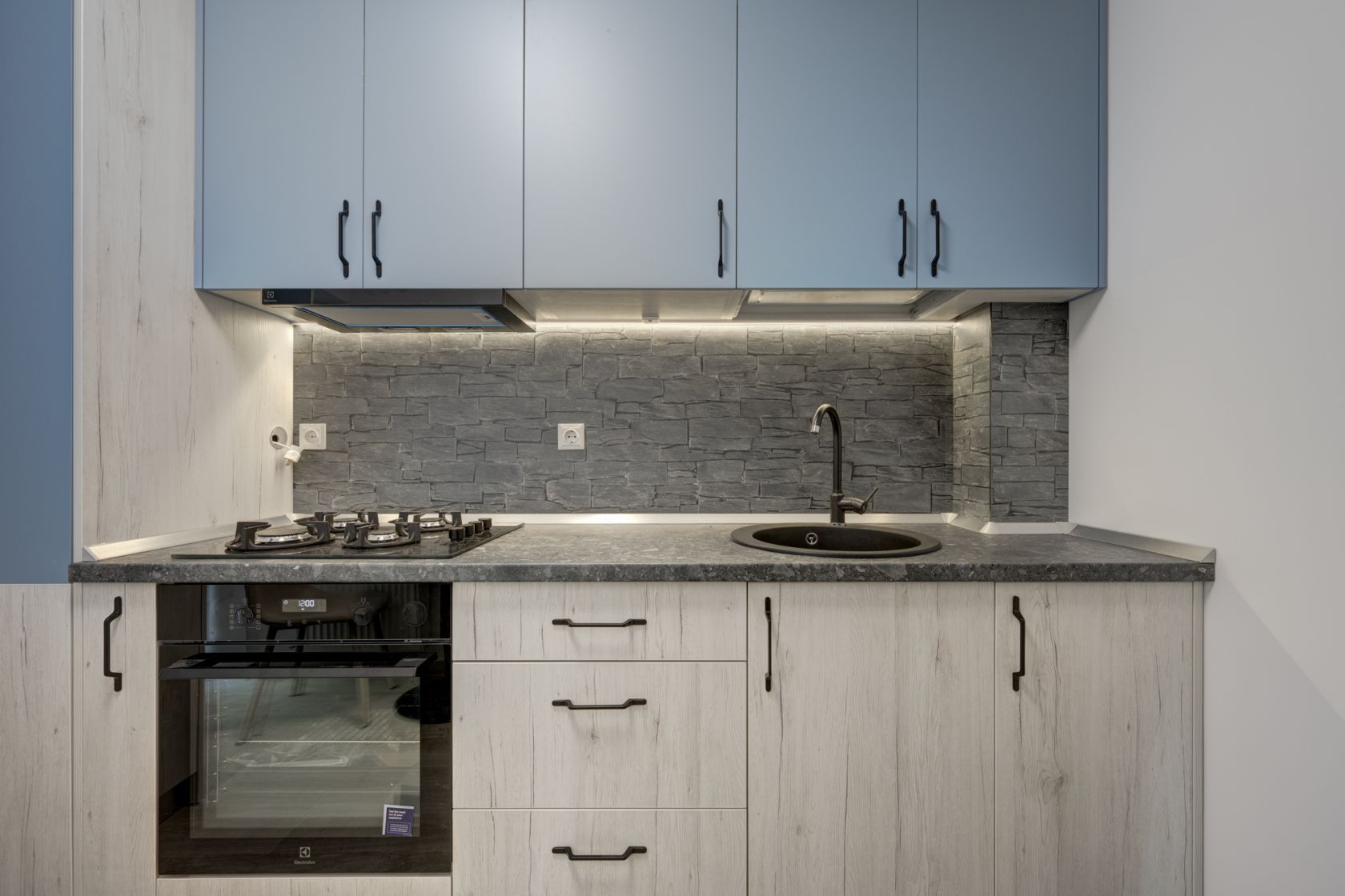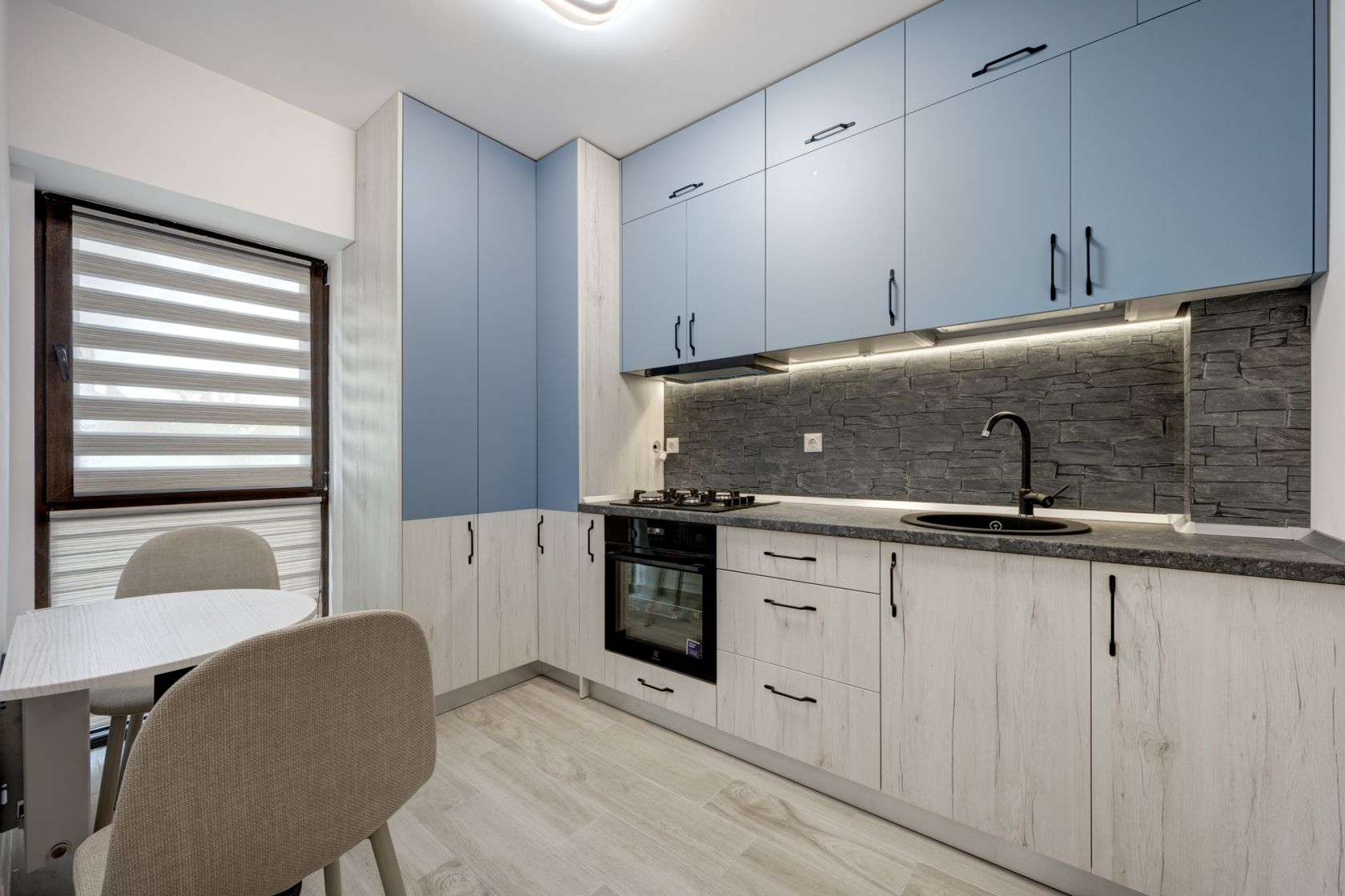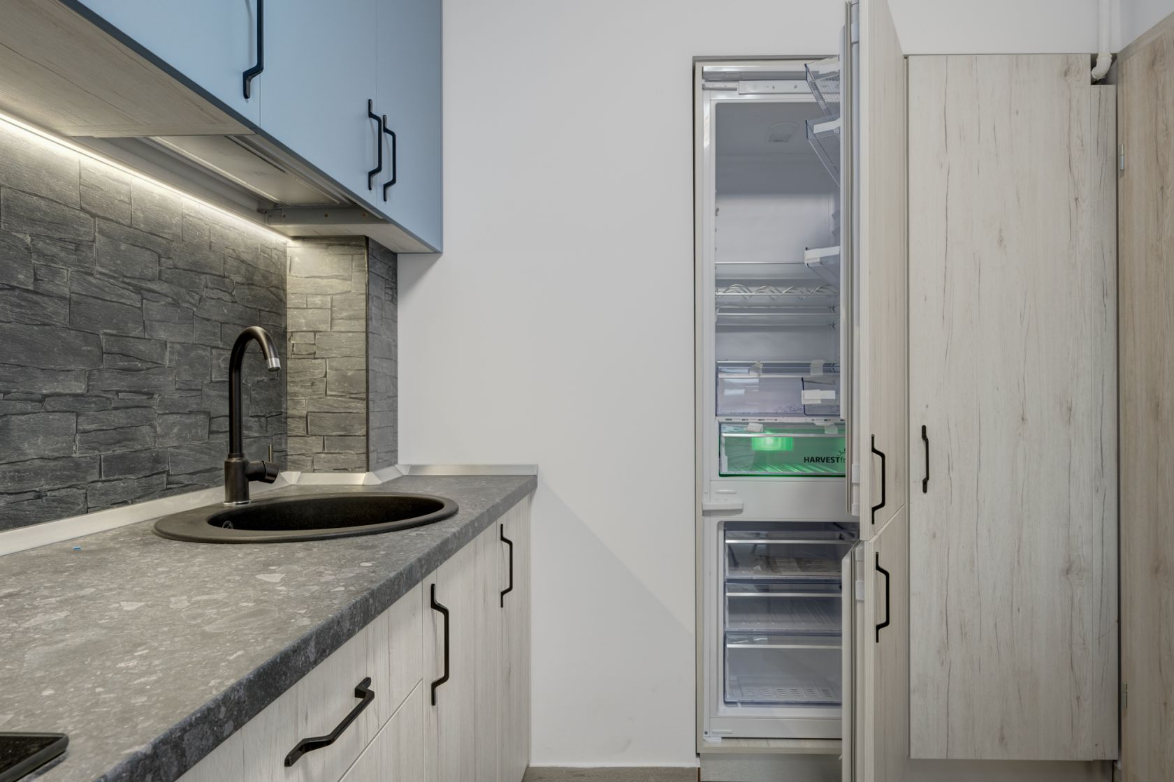 Bucataria este amenajata cu mobilier realizat pe comanda si dotata cu toate electrocasnicele necesare ( plita, cuptor, hota, frigider incorporat). Baia este dotata cu cada si obiecte sanitare si tot in baie este montata masina de spalat rufe.