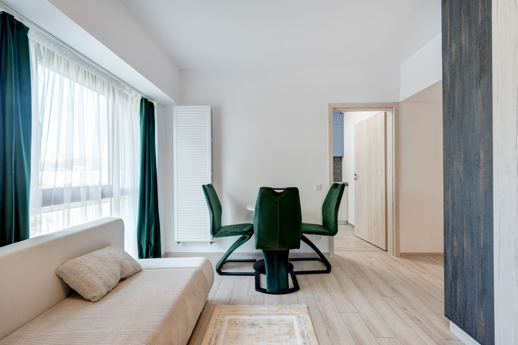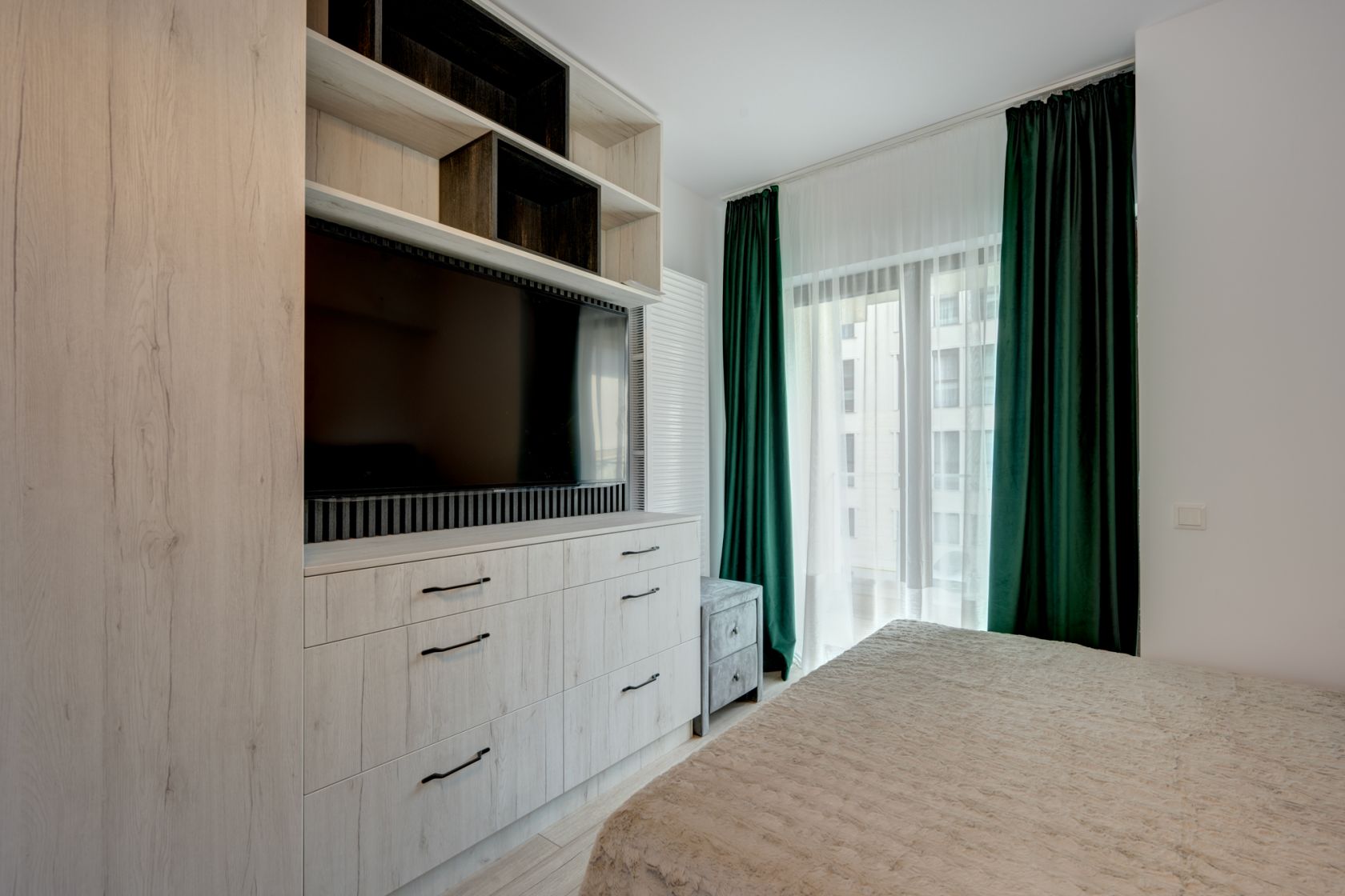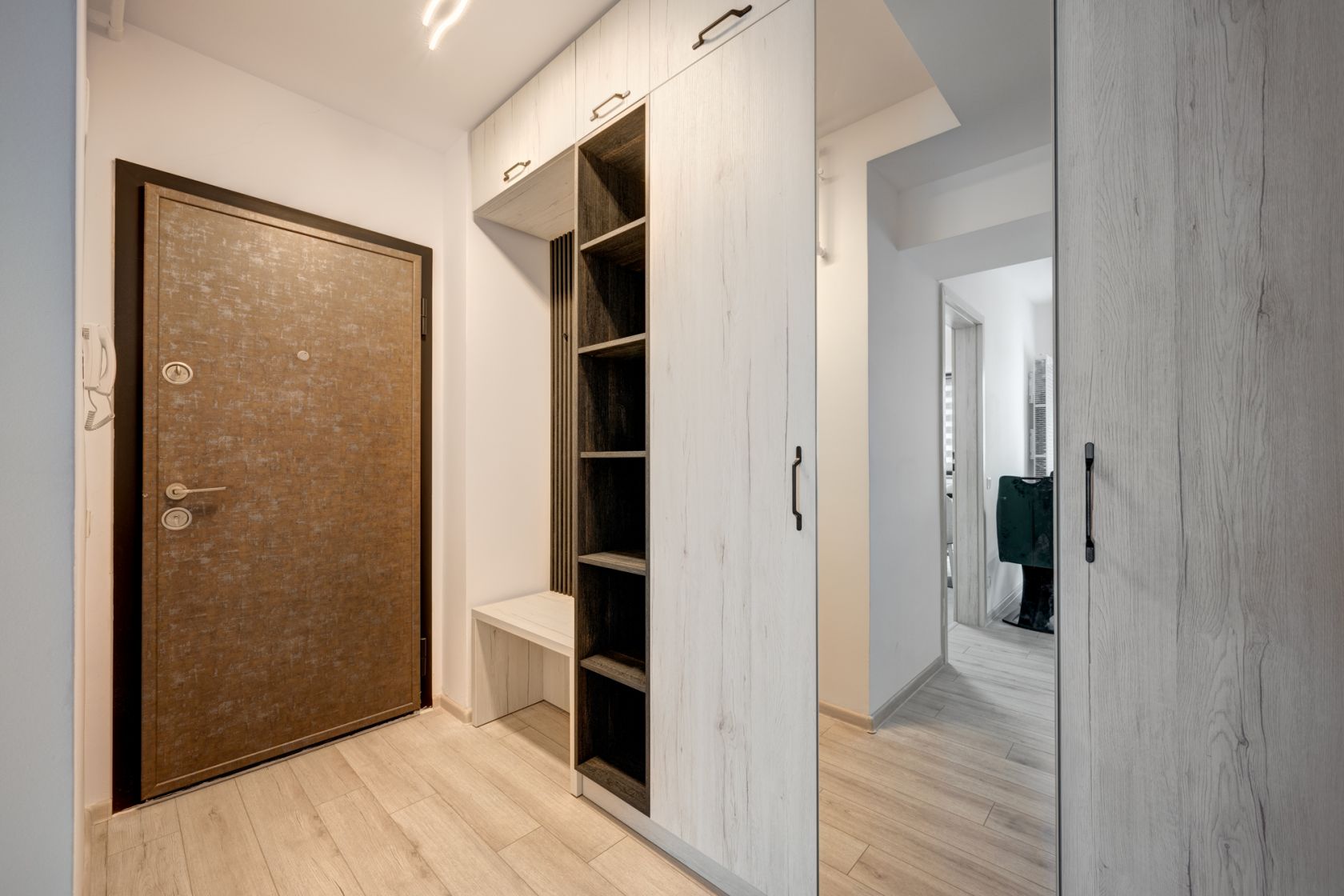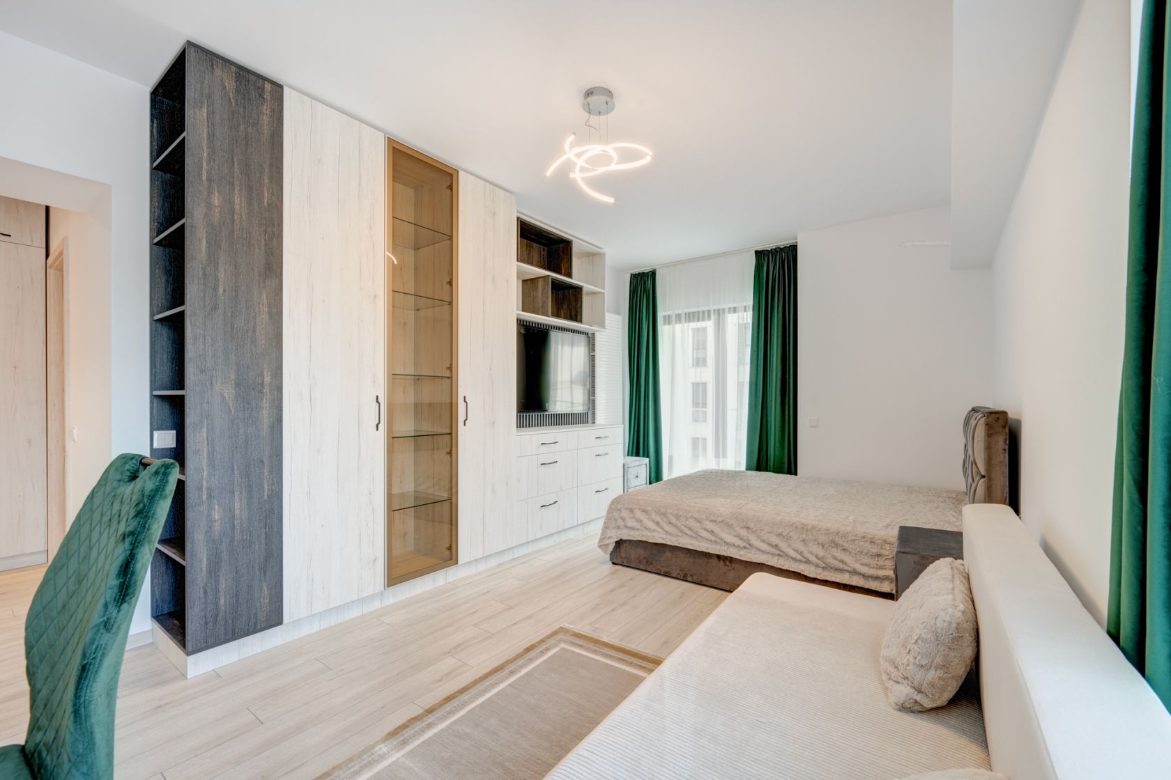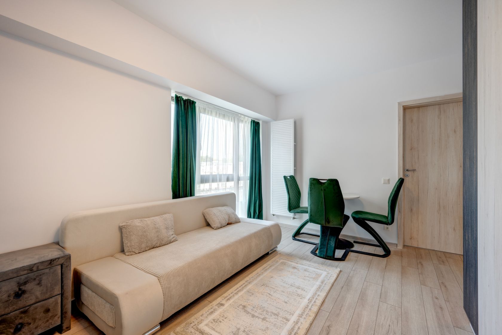 Garsoniera este situata la etajul 1/10 intr-un imobil predat in folosinta in anul 2023. Garsoniera este spatioasa, are o suprafata de 39 mp si beneficiaza de o terasa cu acces din living. Garsoniera este complet mobilata si utilata si este la la a doua inchiriere. Este amenajata modern si beneficiaza de multe spatii pentru depozitare. Holul de la intrare este amenajat cu un dressing spatios, livingul are de asemenea mobilier cu spatii pentru depozitare, un pat matrimonial  si o canapea extensibila, zona de luat masa, TV.  Este instalat deja un aparta de aer conditionat.