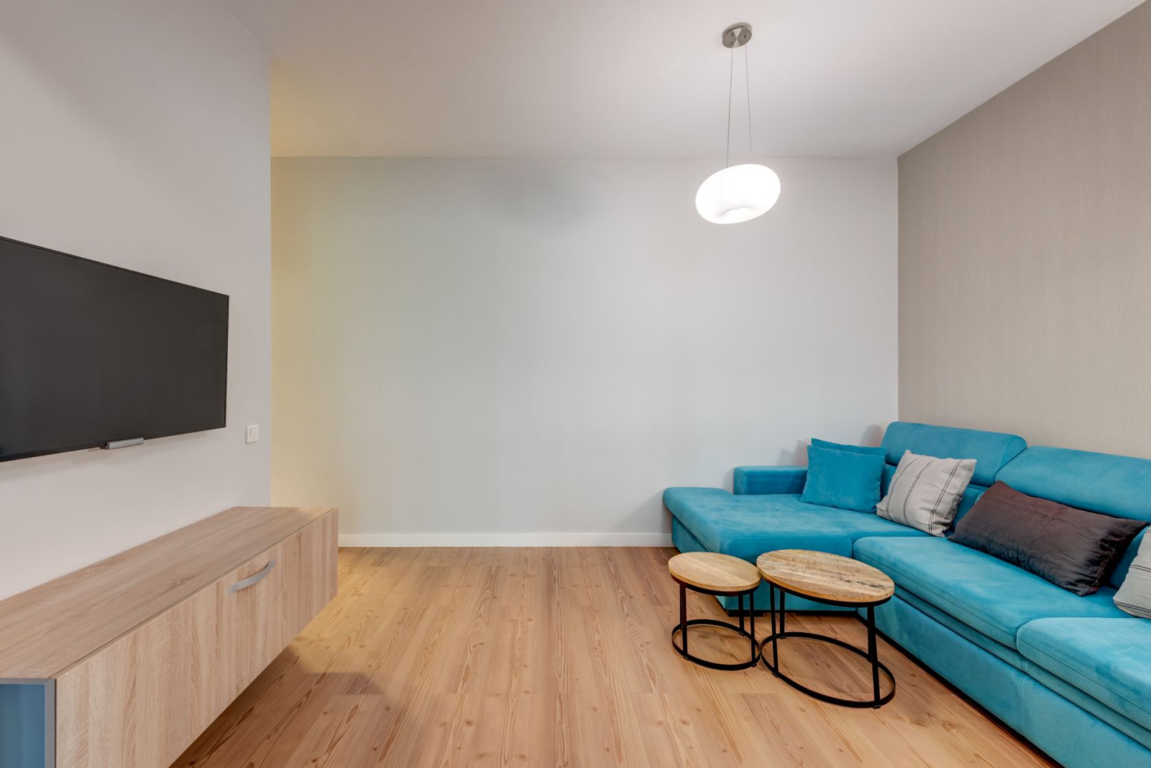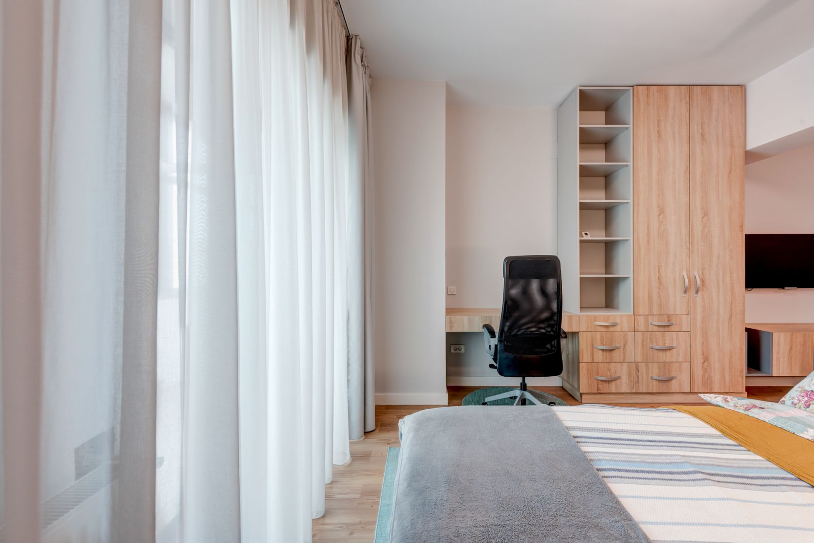 Camera, in suprafata de aproximativ 30 mp, a fost impartita in doua zone separate printr-o biblioteca/ etajera moderna. Zona de zi este amenajata cu o canapea extensibila, 2 masute de cafea, comoda si TV. Zona de dormit este amenajata cu pat matrimonial, dulap de haine si un birou cu scaun.