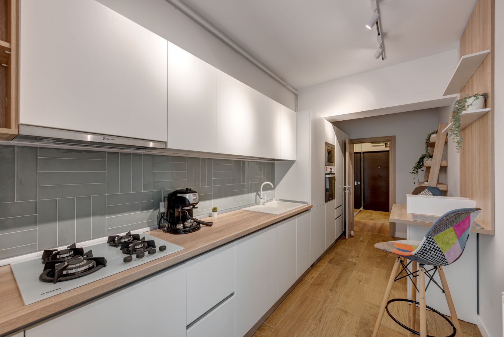 Bucataria este mobilata si utilata complet si are o suprafata de 12mp. Linia de bucatarie este extrem de generoasa cu multe spatii de depozitare si electrocasnice incorporate ( frigider incorporat, plita, cuptor, hota, masina de spalat vase, cuptor cu microunde incorporat si masina de spalat rufe). Exista inclusiv espressor de cafea.