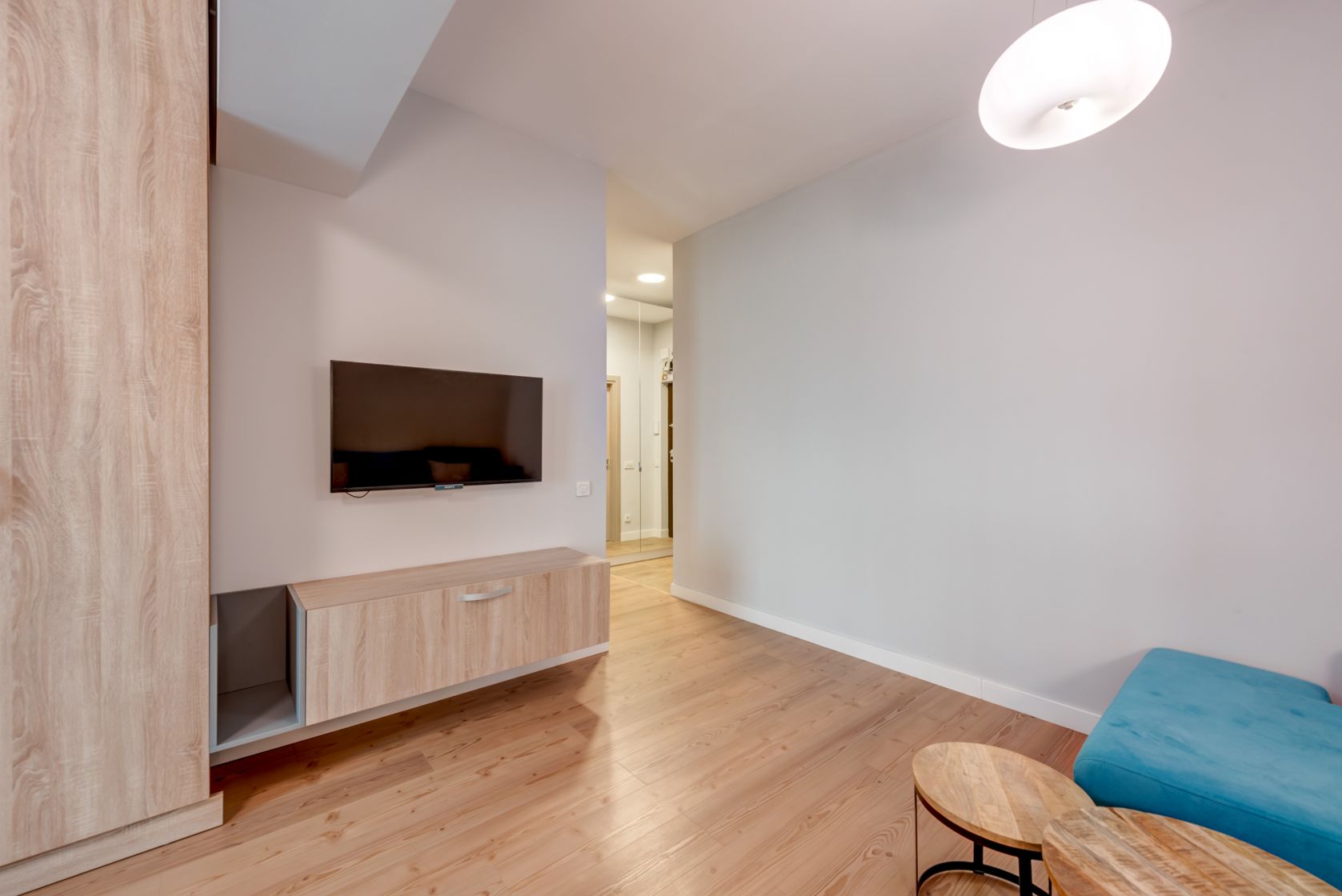 Camera, in suprafata de aproximativ 30 mp, a fost impartita in doua zone separate printr-o biblioteca/ etajera moderna. Zona de zi este amenajata cu o canapea extensibila, 2 masute de cafea, comoda si TV. Zona de dormit este amenajata cu pat matrimonial, dulap de haine si un birou cu scaun.