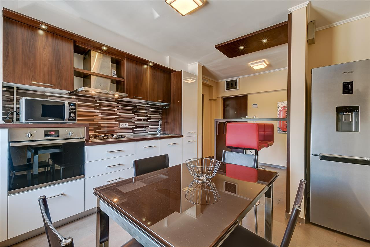 Bucataria este mobilata si utilata cu plita cu gaz si cuptor, cuptor cu microunde, hota, frigider. Apartamentul beneficiza de un hol generos la intrare dotat cu un dulap generos pentru depozitare. Balconul cu acces din living este inchis cu tamplarie pvc cu geam termopan.