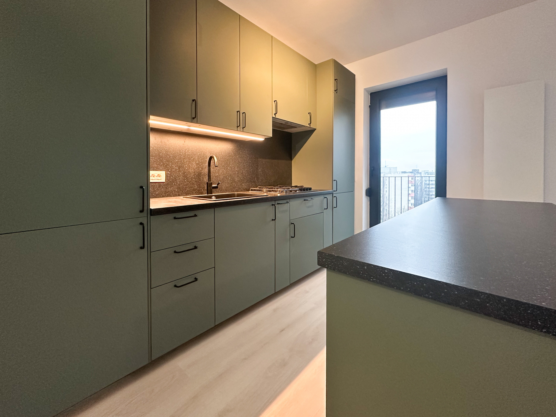 Open space-ul cu bucătăria creează acea senzație de libertate pe care apartamentele compartimentate nu o pot oferi niciodată. Te miști fluid între gătit, conversație și relaxare – totul se întâmplă natural, fără pereți care să îți taie ritmul vieții. Cele 2 aparate de aer condiționat îți garantează confortul indiferent de anotimp. Rulourile exterioare la toate geamurile – cele de la living chiar electrice – îți dau controlul total asupra luminii și intimității.