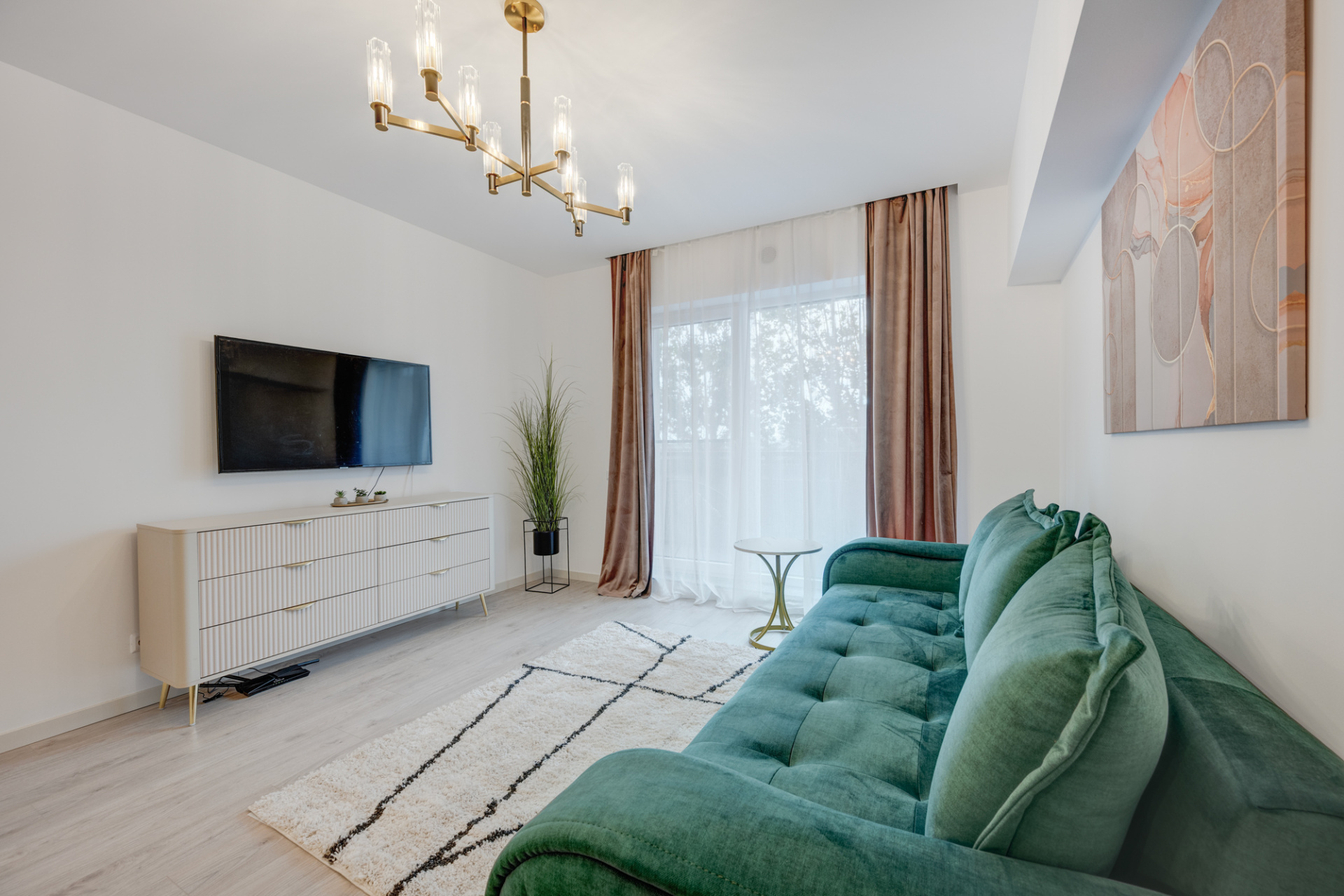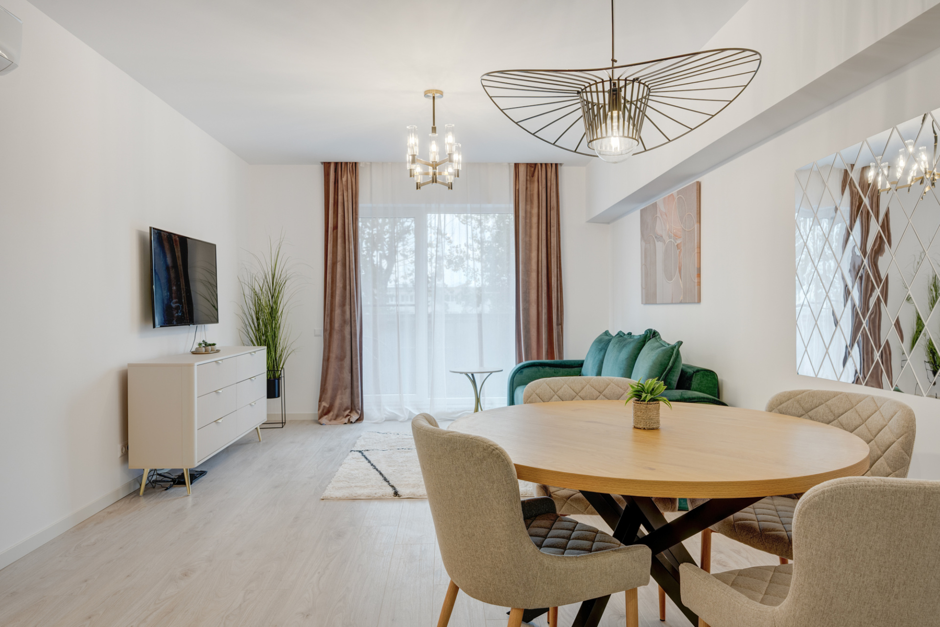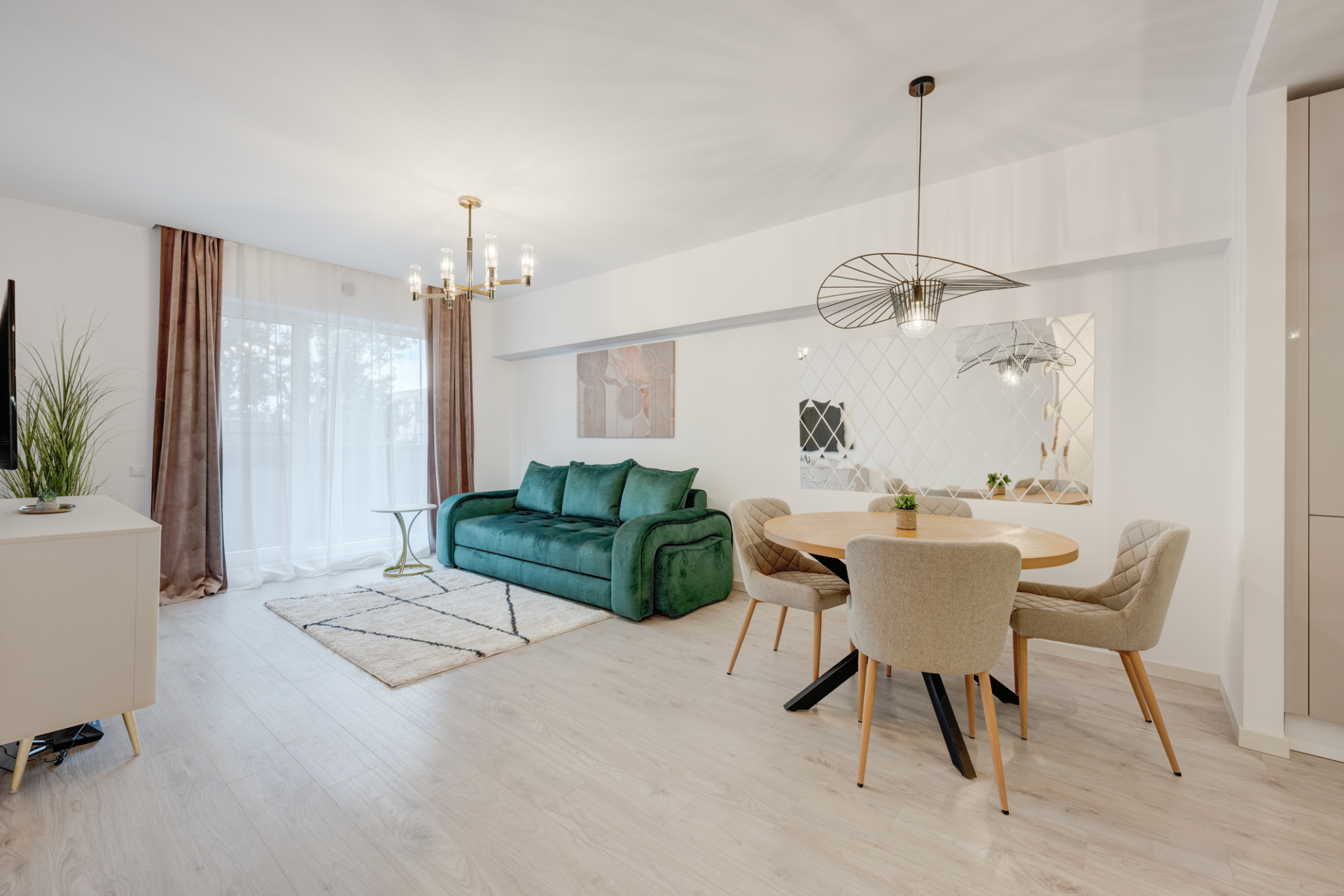 Apartamentul este modern amenajat, decorat cu perdele, corpuri de iluminat moderne (Mobexpert).