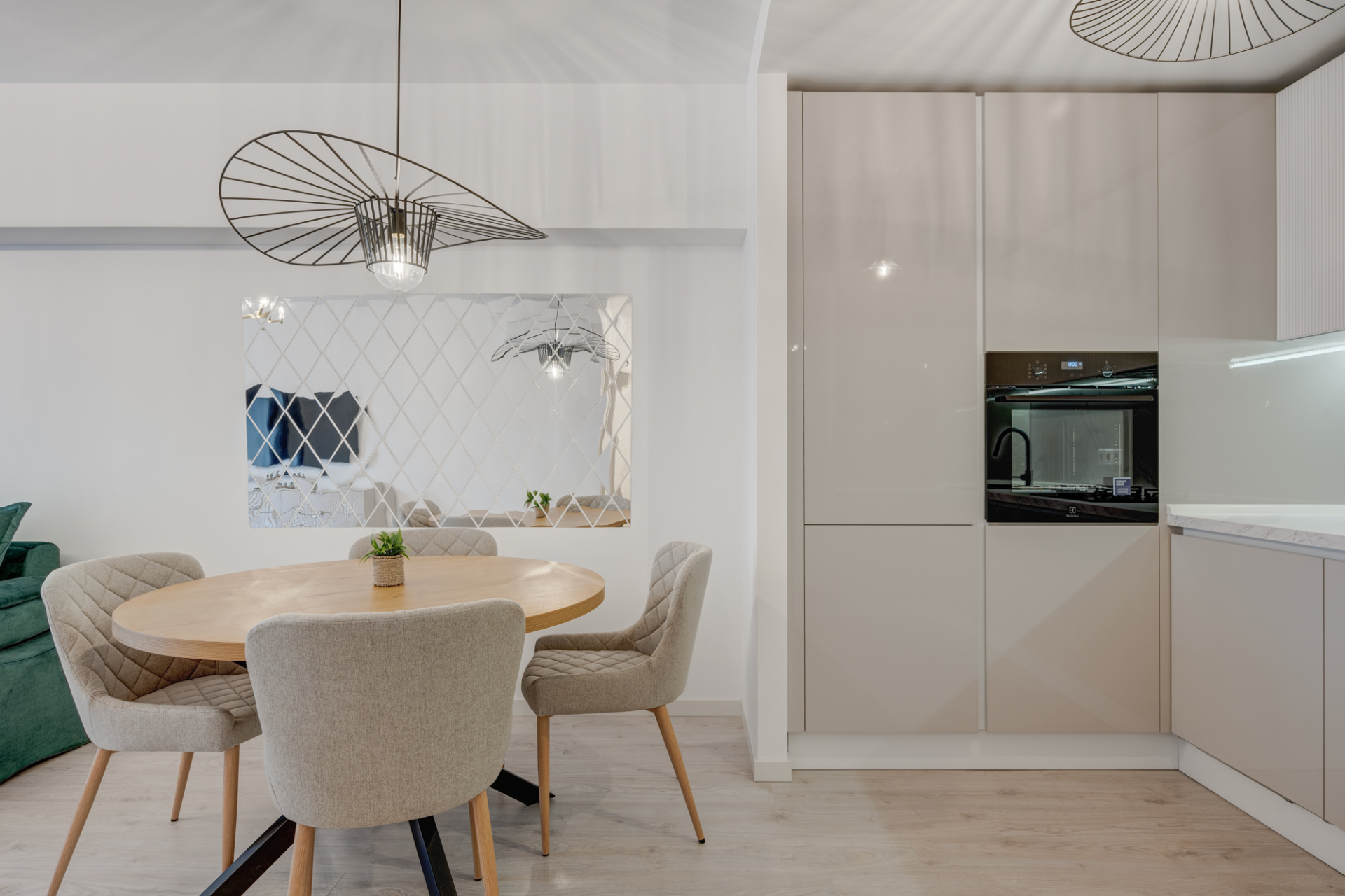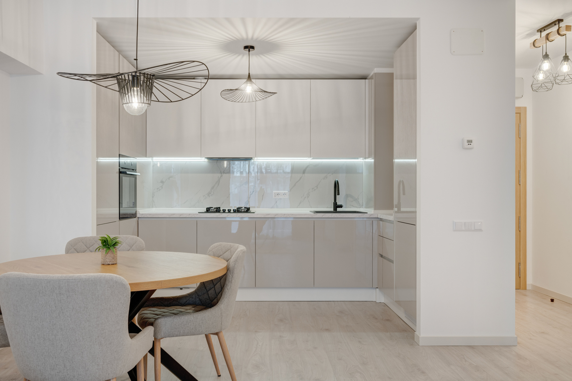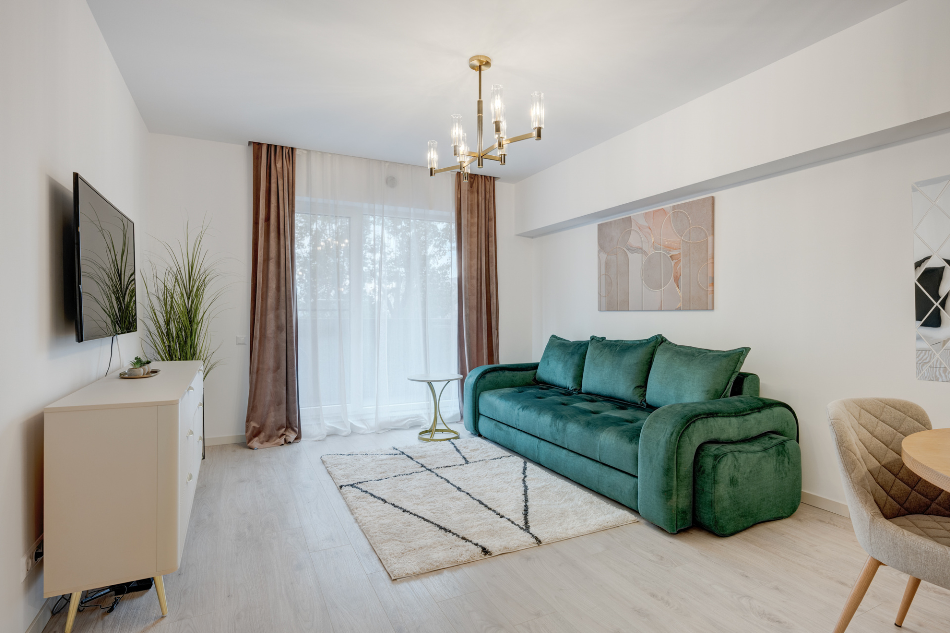 Apartamentul este modern amenajat, decorat cu perdele, corpuri de iluminat moderne (Mobexpert).