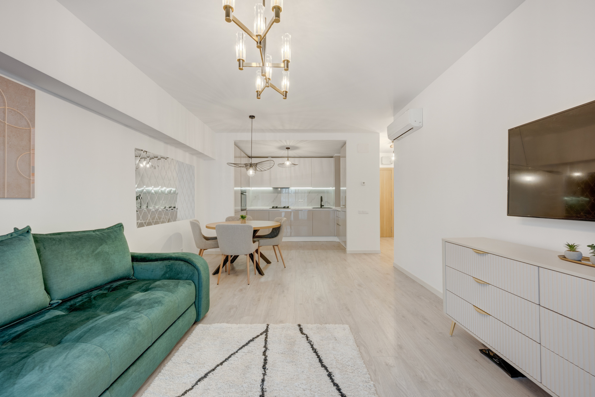 Livingul este amenajat modern cu o canapea extensibila, loc de dining pentru 4 persoane si o comoda Mobexpert cu Smart TV nou. Dormitorul este complet mobilat cu dressing generos, pat matrimonial cu saltea si doua noptiere.