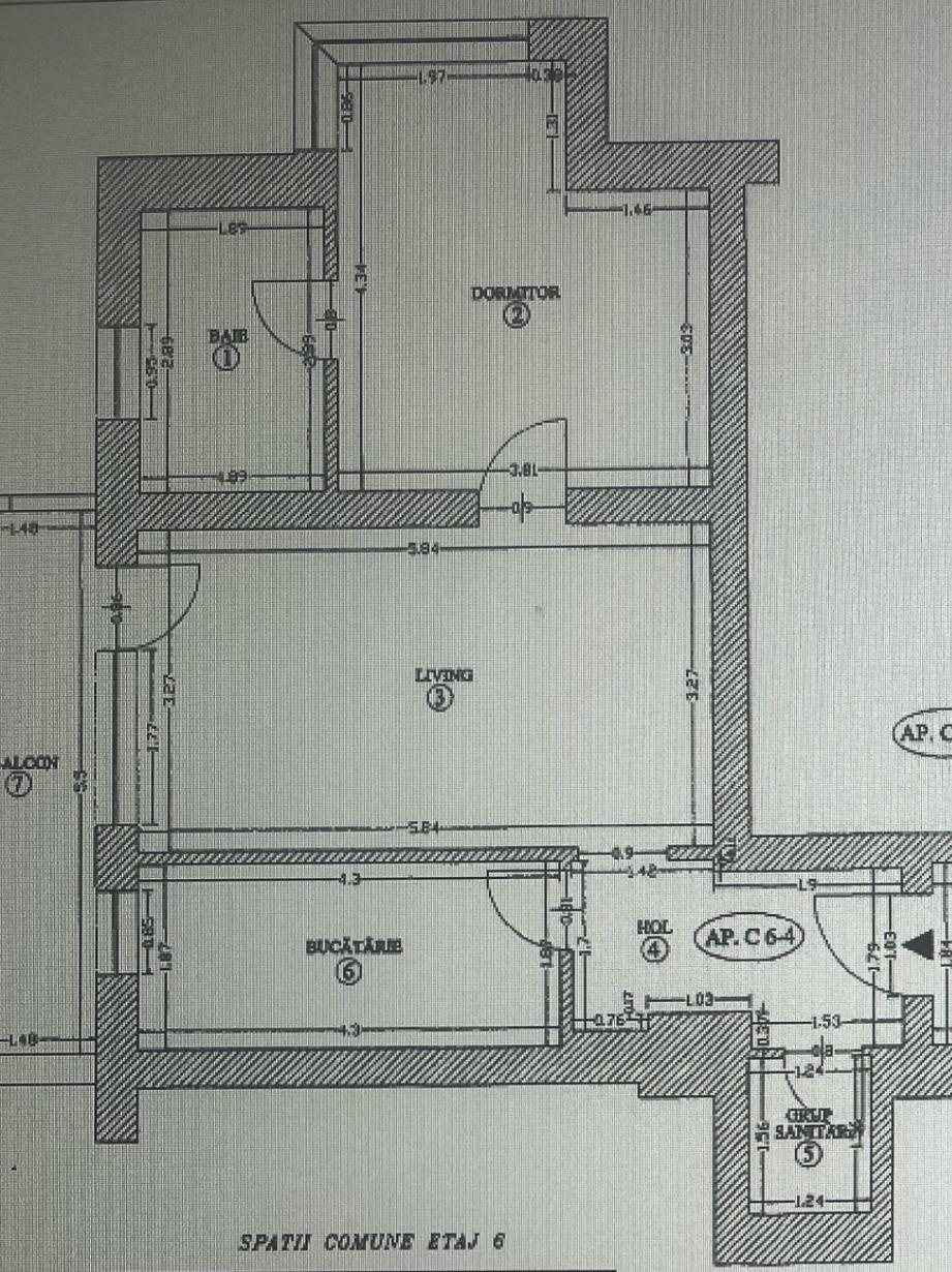 Bucataria inchisa mobilată si utilată, living, dormitor cu baie proprie cu fereastra, si un grup sanitar.