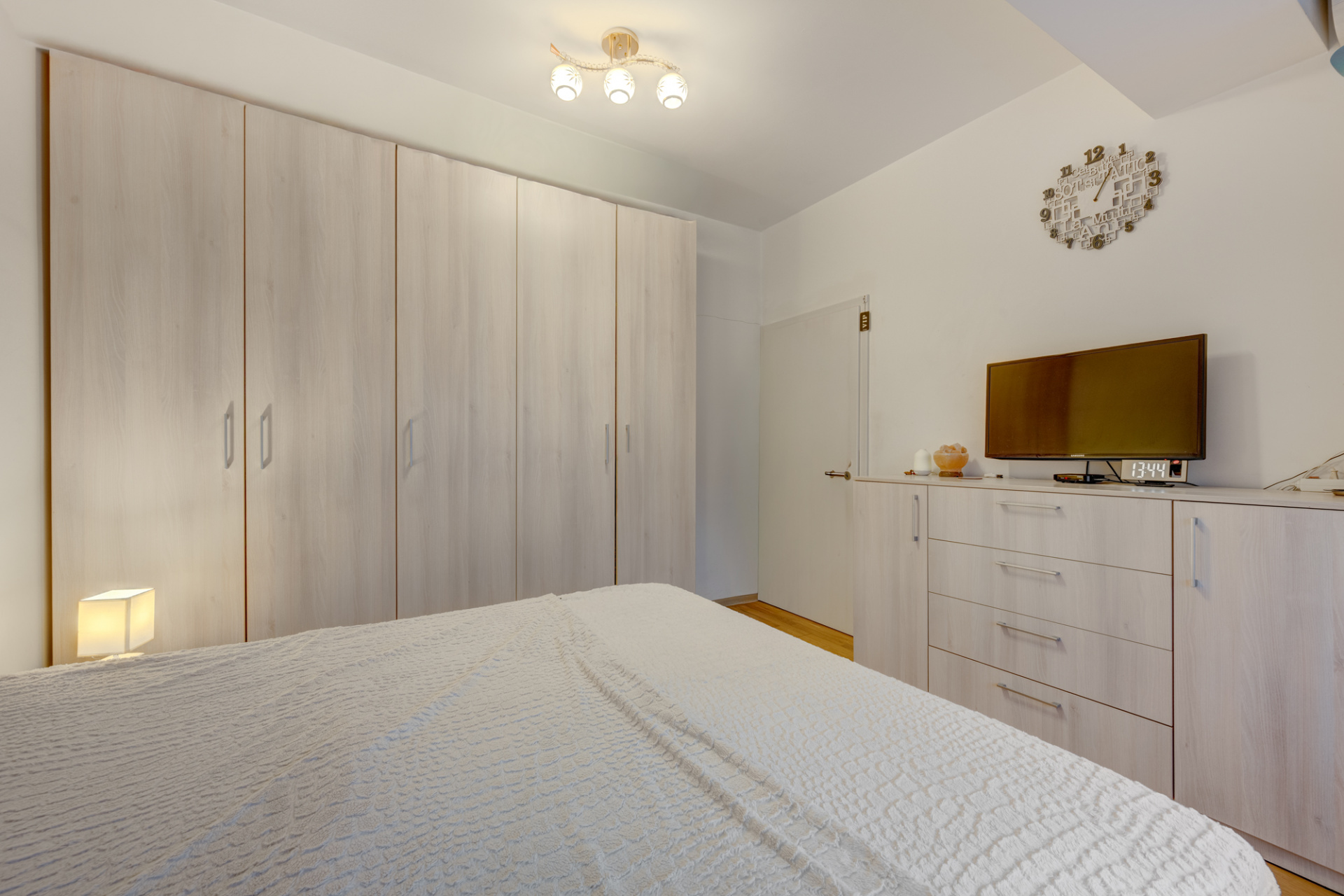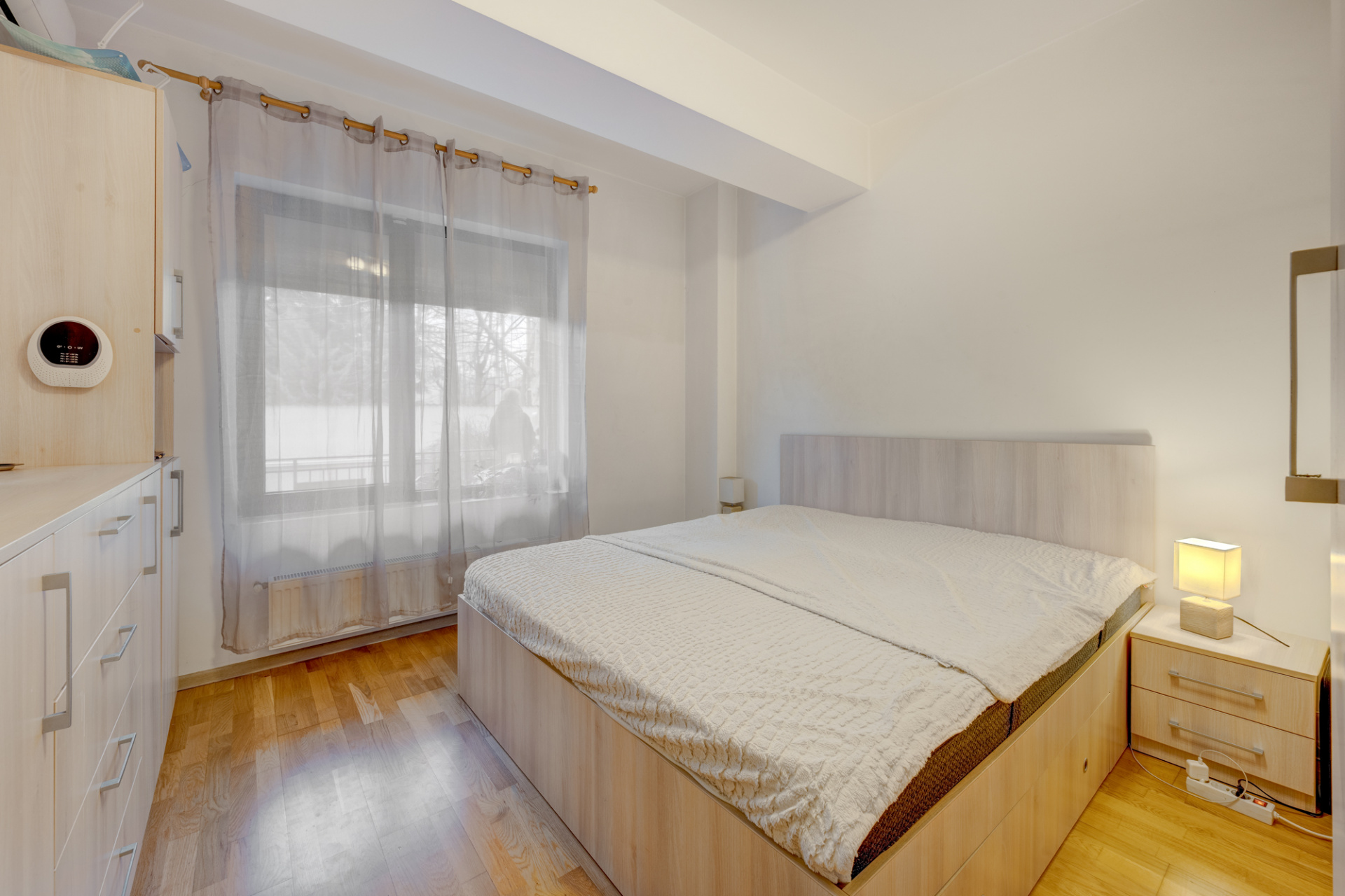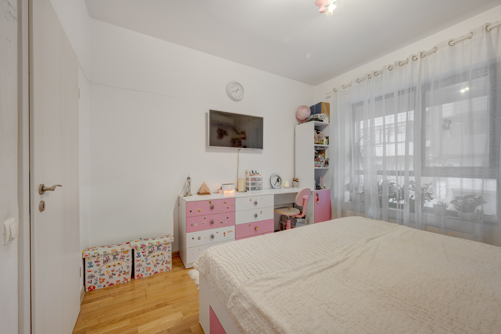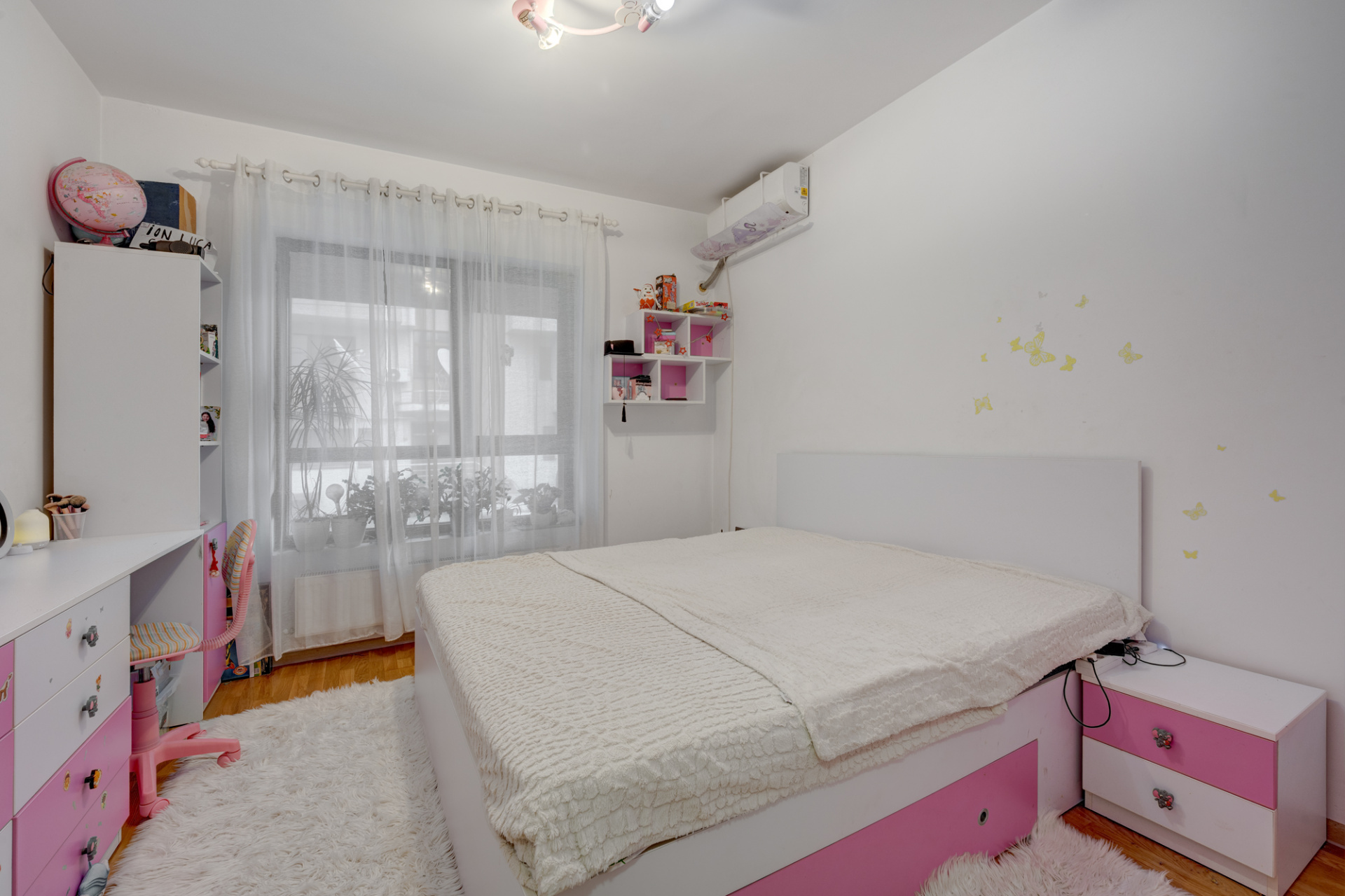 Zona dormitoarelor este deservita de un alt hol (in care s-a amenajat un dulap suplimentar) si de cele doua grupuri sanitare. Grupul sanitar principal are fereastra si este amenajat cu cada iar grupul sanitar de serviciu este amenajat cu cabina de dus si are aerisire pe coloana cu ventilator. Dormitoarele au suprafetele aproximativ egale ( 12,86mp si 12,73 mp) si beneficiaza de ferestre generoase. Tot apartamentul beneficiaza de ferestre panormaice si rulouri exterioare la toate ferestrele. Tamplaria pvc este Rehau culoare antracit.