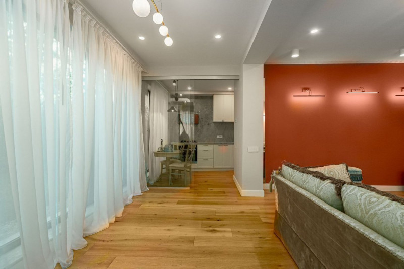 Apartamentul spatios de 90mp amenajat de o echipa de design interior beneficiaza si de o curte proprie de 77mp fiind localizat la parter . Dispune de un living spatios de 30 mp, doua dormitoare din care unul este transformat in dressing, doua bai mari de aprox 5 mp, una cu dus si una cu cada si o bucatarie plus camara de aprox 12mp. Accesul in curtea prorprie se face din cele 3 incaperi si din bucatarie. Toate materialele folosite sunt high end cu finisaje si dotari premium dupa cum urmeaza: