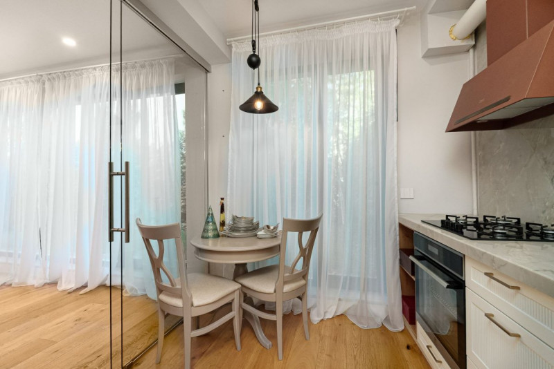In pretul afisat se vinde impreuna cu dressingul din dormitor, corpuri de iluminat design si cu bucataria mobilata si utilata pe comanda cu blat si contrablat din piatra naturala si cu urmatoarele electrocasnice: