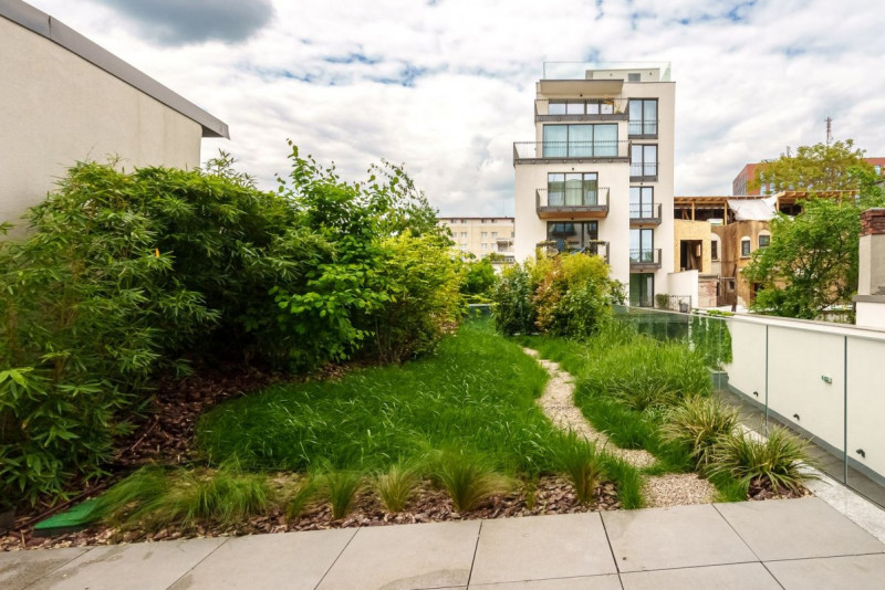 Gradina proprie de 77mp este amenajata cu vegetatie matura, gazon, iedera, pomi si sistem de irigatii