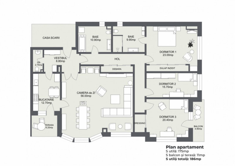 Apartamentul are o suprafata utila de 175mp, decomandat, la care se adauga o terasa si un balcon a caror suprafete insumeaza 11mp. Din holul larg, cu spatiu suficient pentru depozitarea hainelor, patrunzi intr-o senzationala camera de zi: 56mp! Cum ar fi ca de Craciun sa poti pune masa pentru doisprezece persoane, copiii sa se bucure in jurul bradului, si tot sa ramana loc si pentru dans?