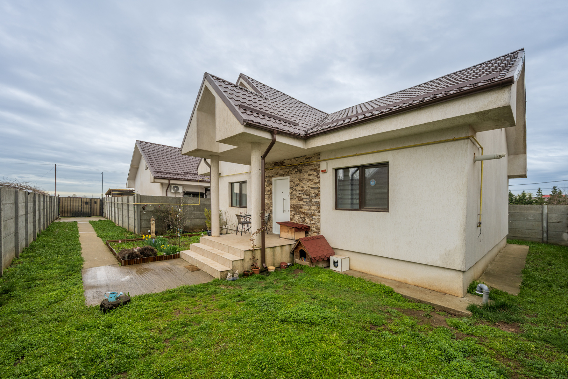 Casa este finisata, dotata cu centrala termica proprie pe gaz ( Ariston in condensatie 23kw) si incalzire prin calorifere din otel, ferestre cu geam termopan si tamplarie pvc, plase de insecte la toate ferestrele, sistem de alarma, usi interioare moderne. Pardoselile sunt placate cu parchet laminat in camere si gresie in hol, baie si bucatarie. Instalatia electrica este pe conductori din cupru (2,5mmp grosime). Proprietatea este in stare foarte buna, a fost locuita 5 ani de proprietari si este extrem de bine intretinuta si nu necesita niciun fel de reparatii sau retusuri, cu exceptia amenajarii podului.