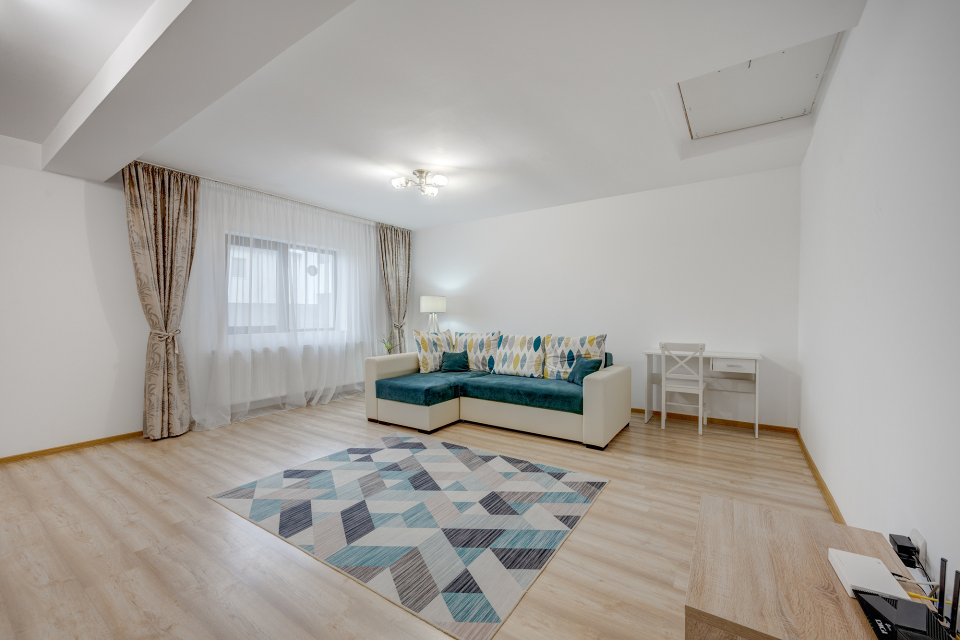 Livingul are o suprafata de 28 mp, este amenajat cu o canapea, birou si mobilier depozitare si comota cu TV. Din living se face accesul catre pod ( pe o scara retractabila). Podul este spatios, are ferestre cu lumina naturala, are instalatiile trase pentru apa si calorifere si este izolat cu vata minerala. Nu este planseu din beton peste parter. Cele doua dormitoare au suprafate de 13,2 mp si 13,4 mp. Unul dintre dormitoare este mobilat iar al doilea dormitor este nemobilat. Grupul sanitar este echipat cu toate obiectele sanitare, cada si are si fereastra pentru aerisire naturala.
