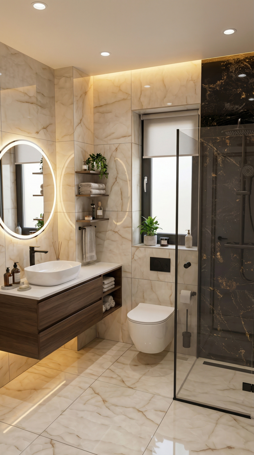La etaj, patru dormitoare, trei băi cu geam și un balcon creează zona de intimitate. Scara interioară solidă leagă armonios cele două niveluri.
