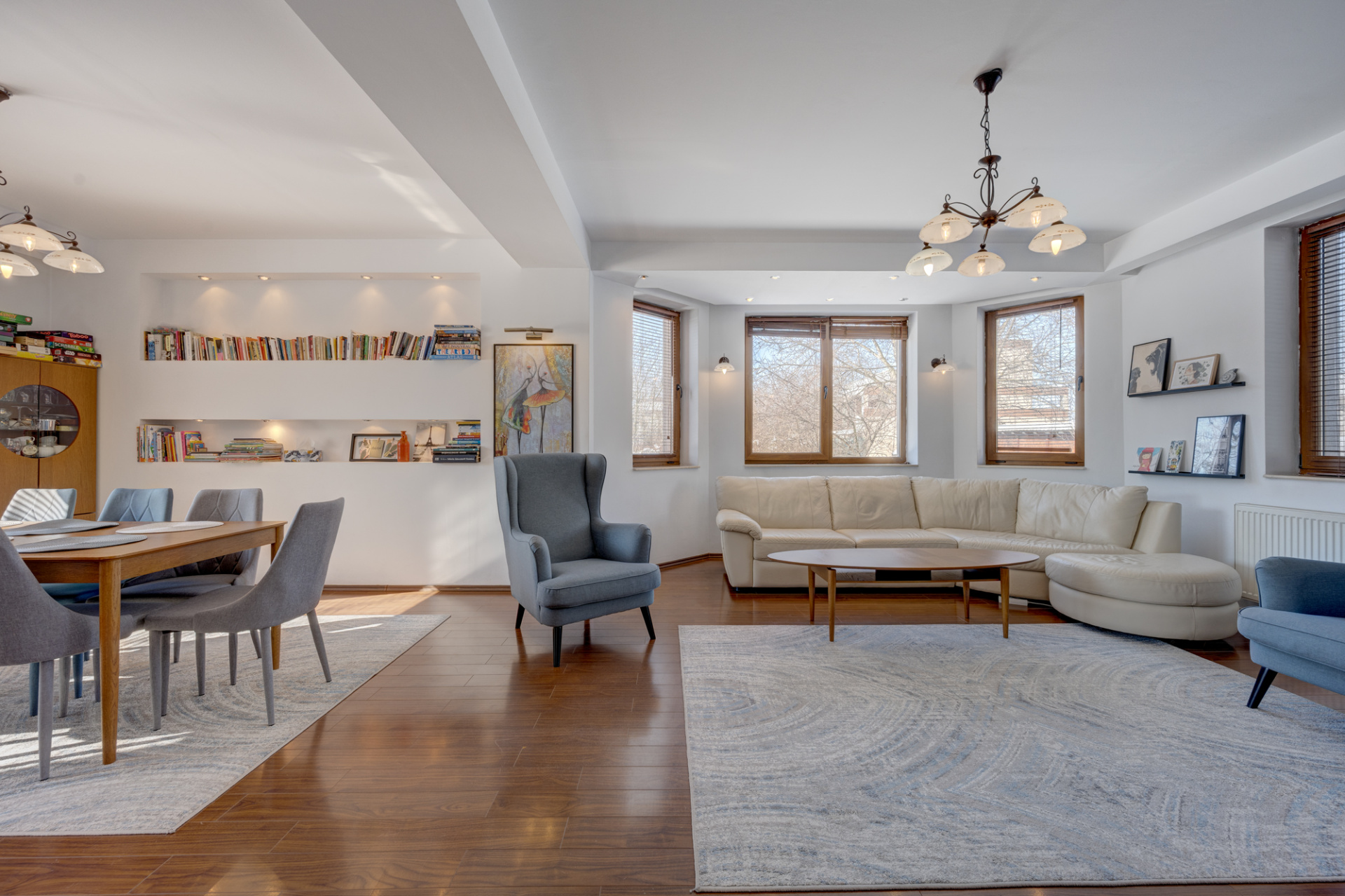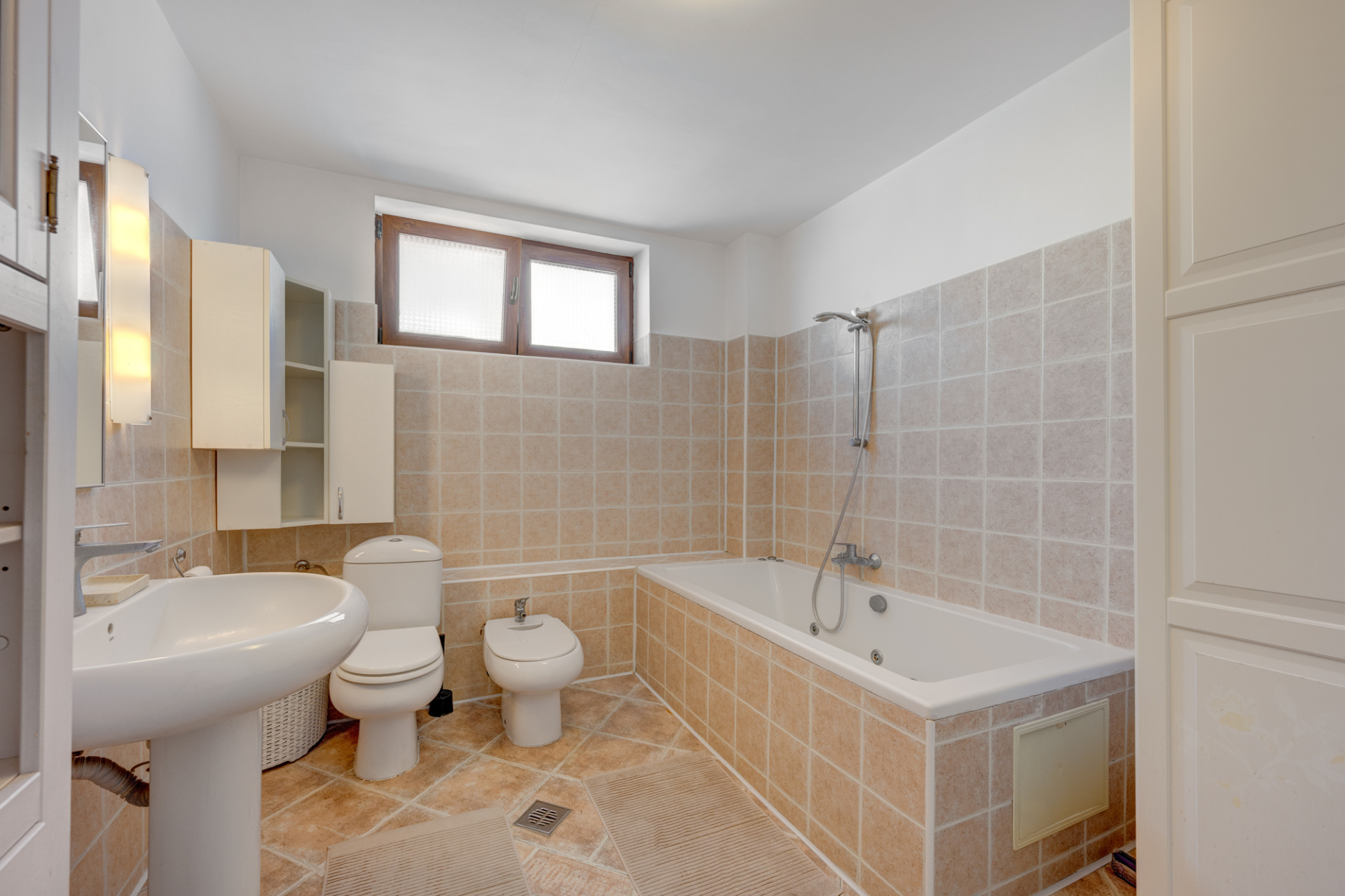 La subsol (19,7mp) este o camera tehnica pentru centrala si un spatiu pentru depozitare amenajat cu rafturi. Bucataria este inchisa, complet mobilata si utilata FRANKE cu toate electricasnicele necesare: plita, cuptor, hota, cuptor cu microunde, masina de spalat vase, frigider, toate incorporate. Tot mobilierul de bucatarie este din lemn masiv. Baia parterului este amenajata cu cabina de dus si beneficiaza de fereastra. Livingul este generos, cu o suprafata de 40 mp si este impartit in doua zone, o zona de dinning cu acces catre terasa exterioara si o zona de relaxare.