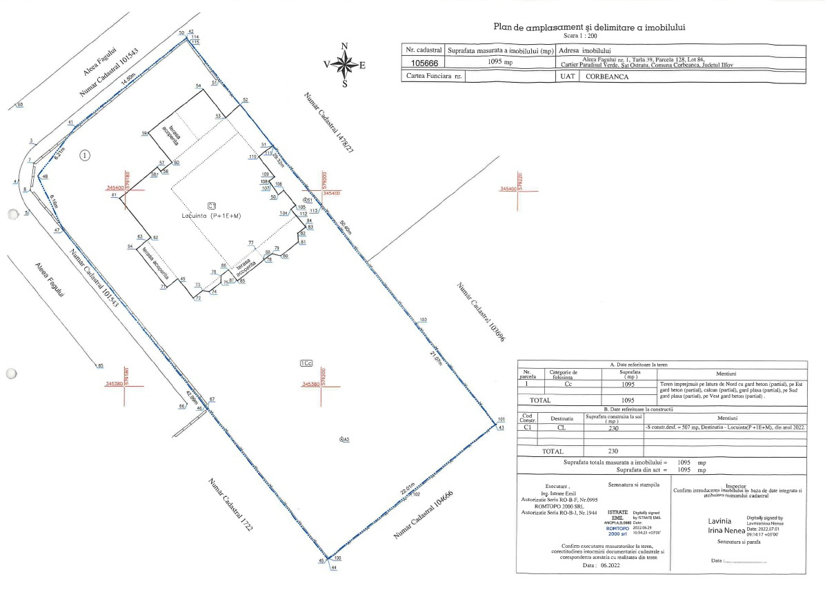 Proprietatea cu Structură: Parter + Etaj + Mansarda cu amprentă de 230 mp si suprafata desfasurata de 507 mp, a fost construita in anul 2007 si renovata integral in anul 2022, pe un teren cu supafata de 1095 mp, cu dubla deschidere de 20 ml si 42 ml.